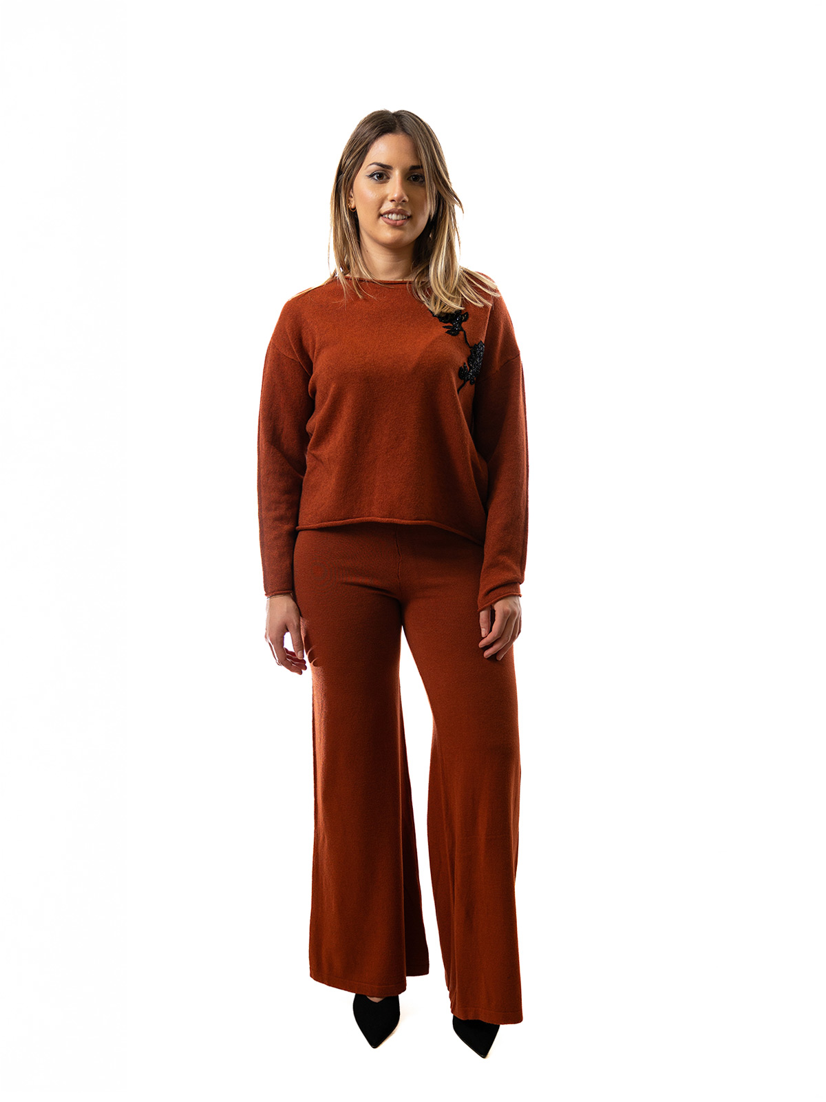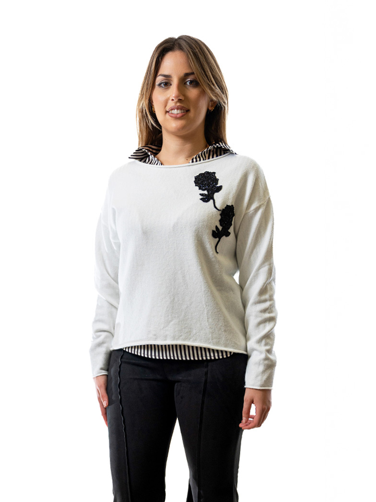 Romantica e dal gusto contemporaneo, questa maglia si distingue per il dettaglio floreale applicato sul davanti, che dona un tocco femminile e raffinato al look. Il retro sorprende con un’apertura delicata che aggiunge leggerezza e movimento alla silhouette. Realizzata in un tessuto morbido ed elasticizzato, è perfetta per creare outfit sofisticati ma comodi, sia di giorno che di sera.