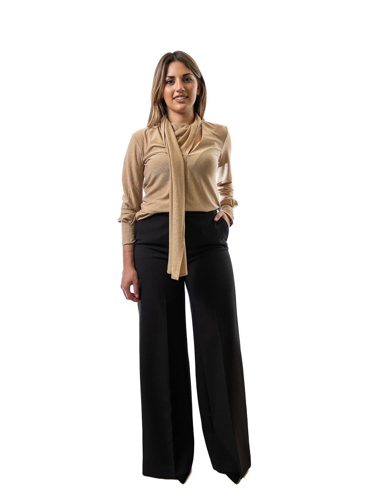 Elegante e brillante, questa maglia in lurex è perfetta per aggiungere un tocco sofisticato ai tuoi outfit. Il collo a sciarpa, morbido e avvolgente, dona movimento e femminilità al design, mentre il filato lurex illumina il capo con discreta eleganza. Ideale per occasioni speciali o per dare luce ai look quotidiani.