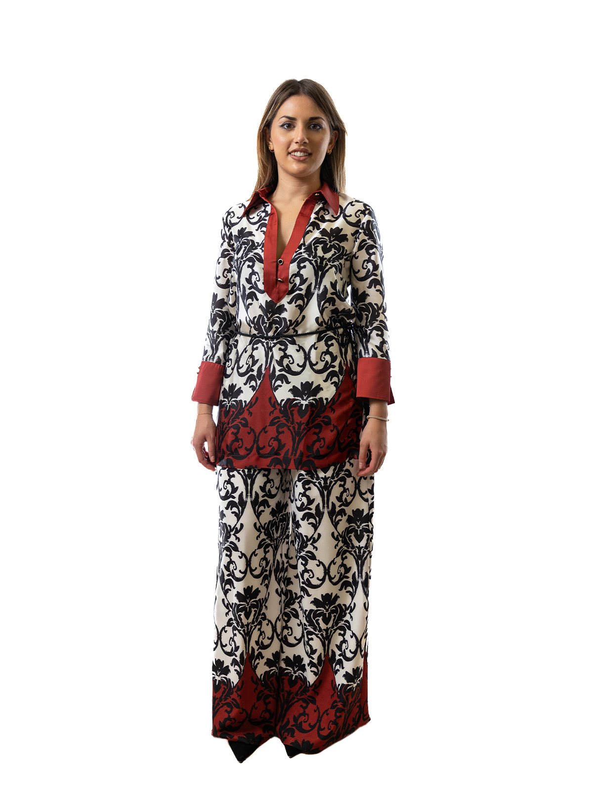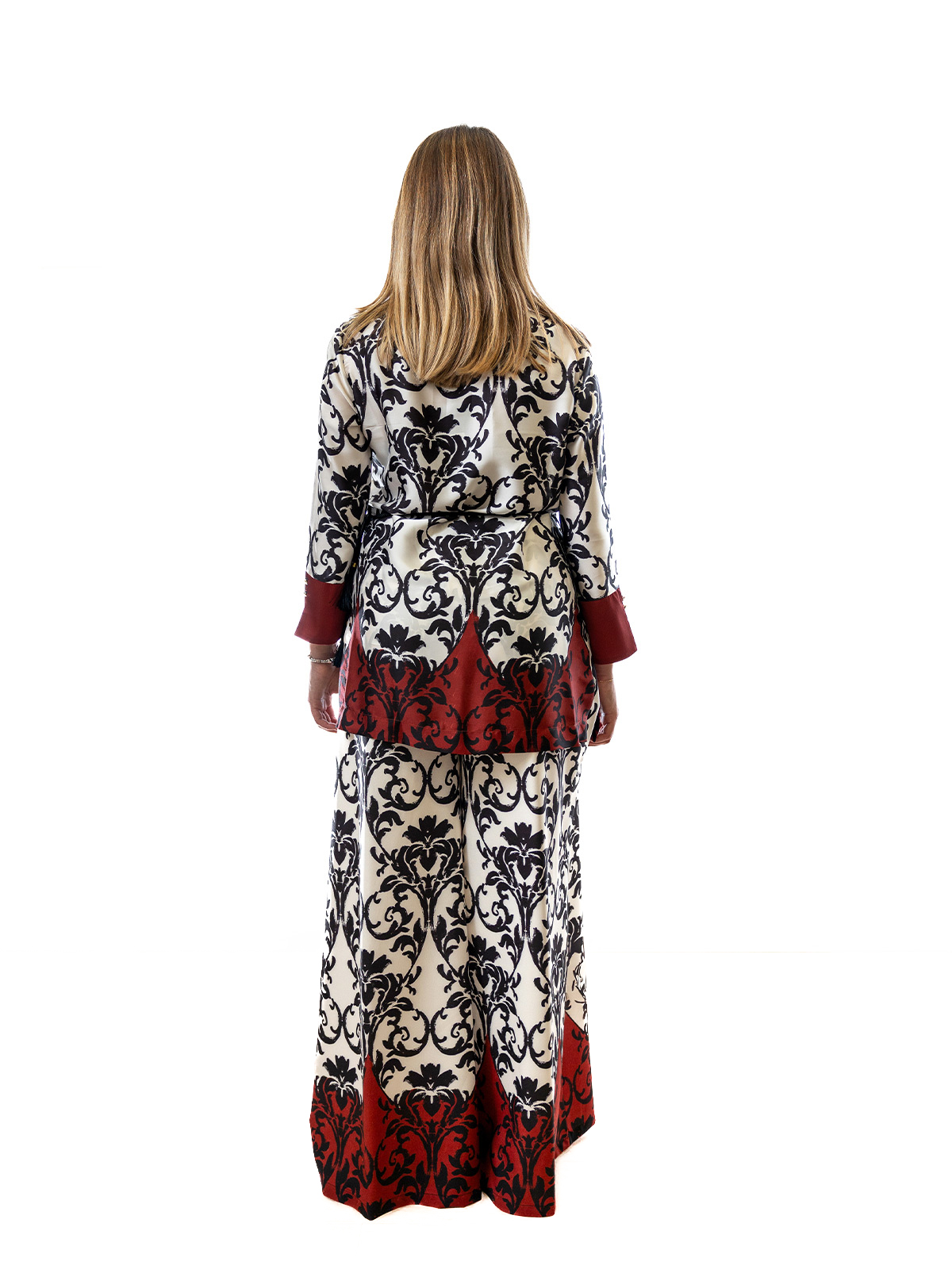 Un capo dal carattere deciso e raffinato. Questo pantalone morbido presenta una ricca fantasia damascata nei toni del bianco e nero che dona eleganza e profondità al look. Il dettaglio della balza finale color coccio crea un contrasto inaspettato e di grande effetto, aggiungendo un tocco caldo e contemporaneo al design. Perfetto per chi ama distinguersi con stile.