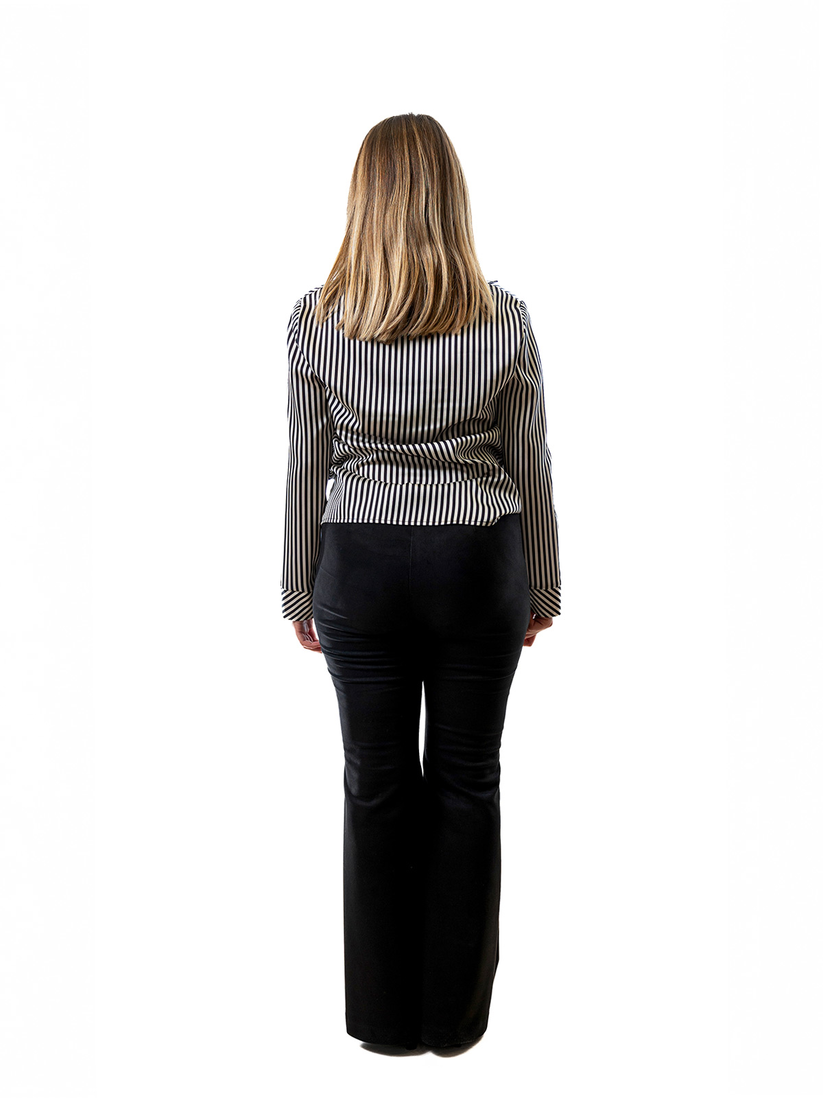 Dal gusto sofisticato e femminile, questo pantalone flare in morbido dainetto valorizza la silhouette con una linea slanciata e un fit aderente sui fianchi. La vita alta enfatizza il punto vita, mentre la gamba leggermente svasata dona un equilibrio armonioso alla figura. Il tessuto effetto suede, morbido al tatto, regala un tocco raffinato e contemporaneo, perfetto per look day-to-night.